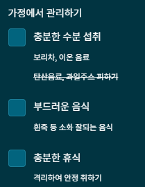 가정에서 할 수 있는 관리 방법으로는 충분한 수분 섭취가 가장 중요합니다. 보리차나 이온 음료를 마시되, 탄산음료와 과일 주스는 피해야 합니다.