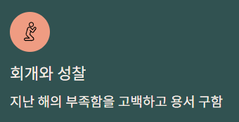 | 회개와 성찰 | 지난 해의 부족함을 고백하고 용서 구함 | 시편 51:1-2 |