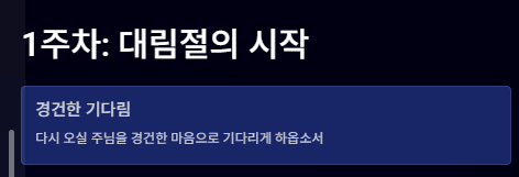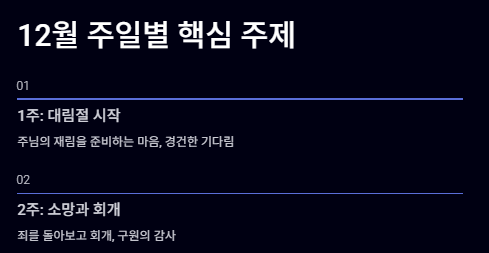| 12월 1주 | 대림절 시작, 기다림 | 주님의 재림을 준비하는 마음, 경건한 기다림 |