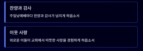 각 주일의 설교 주제나 교회 행사와 연계하면 더욱 적절한 기도가 됩니다.