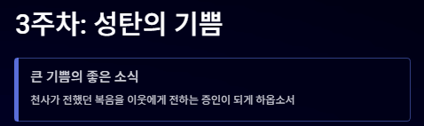 | 12월 3주 | 기쁨과 찬양 | 성탄의 기쁨을 미리 맛봄, 감사와 찬양 |